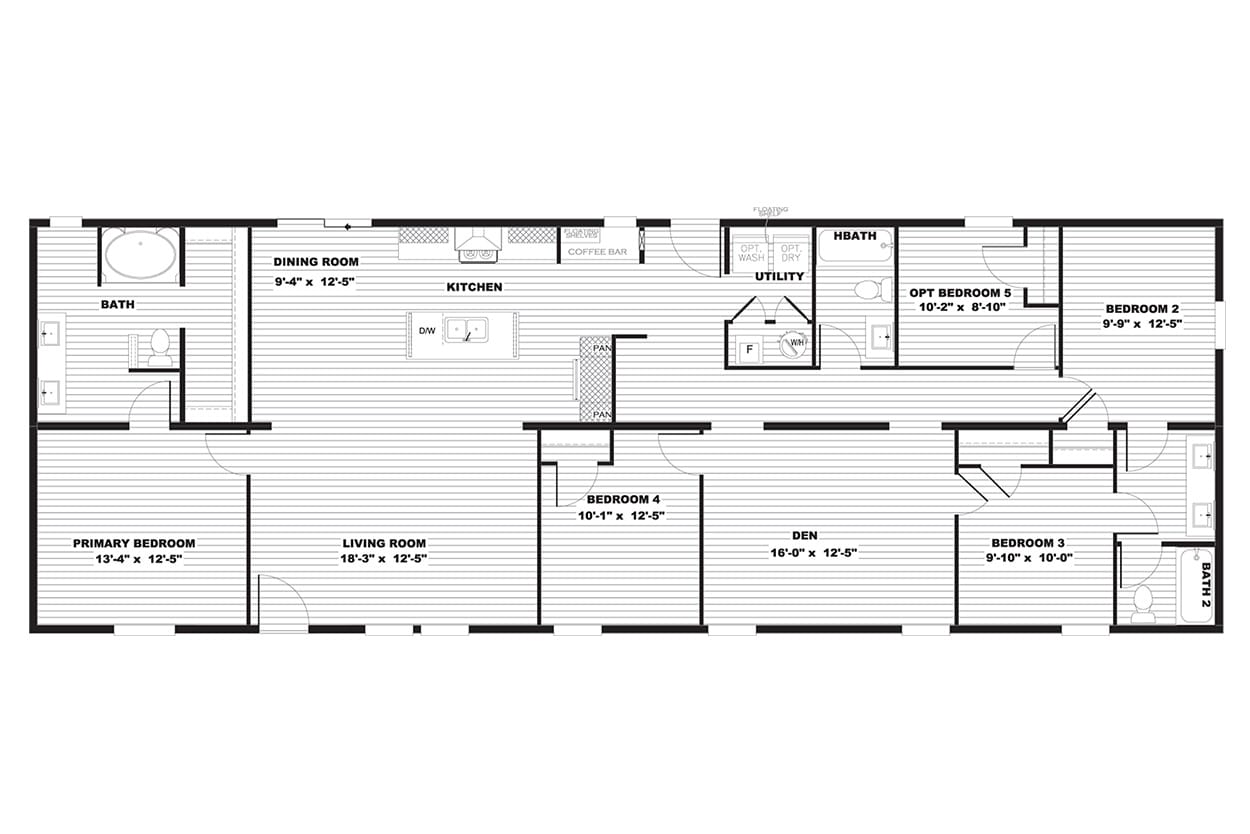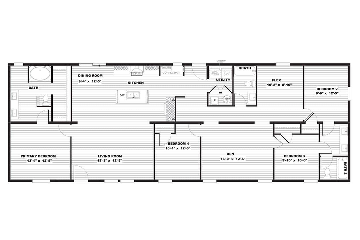 A long white modular home rendering features black shutters, steps to the door, and a green lawn in front.
