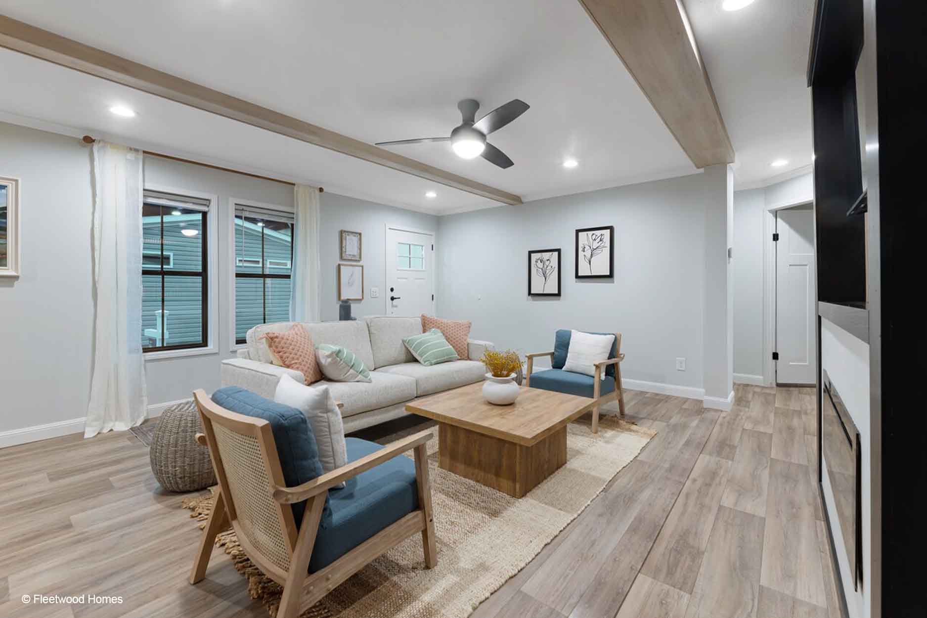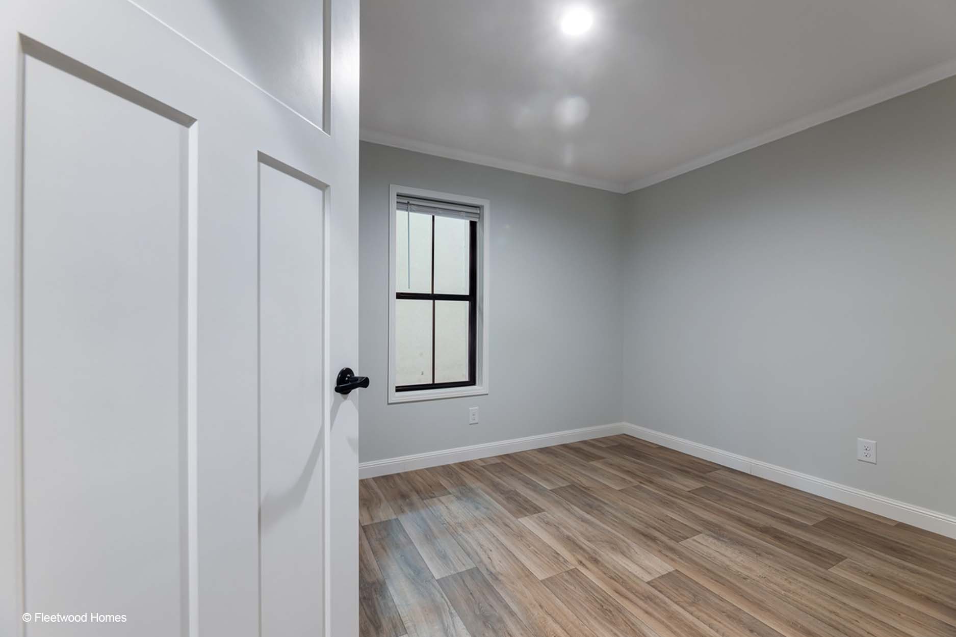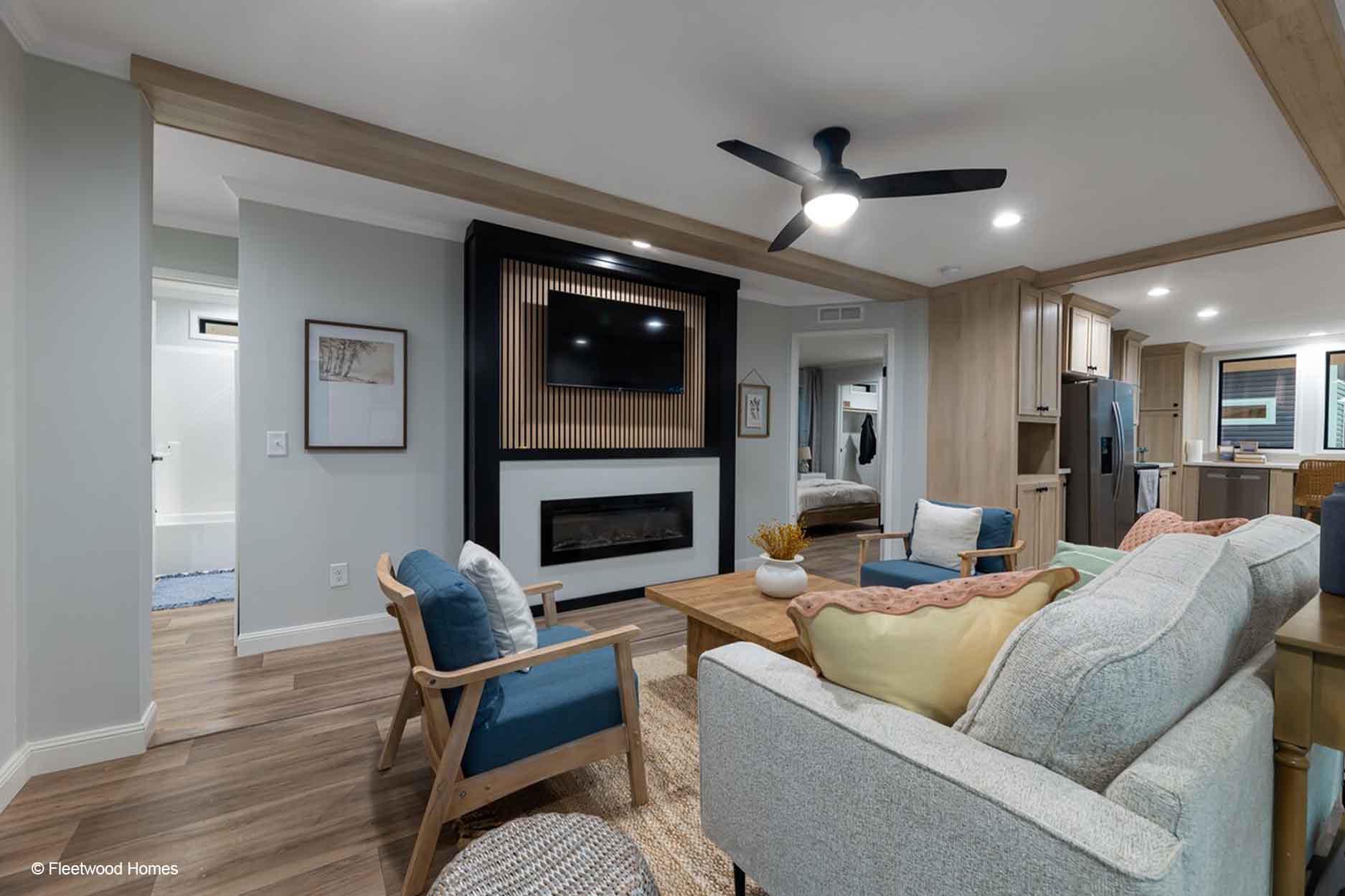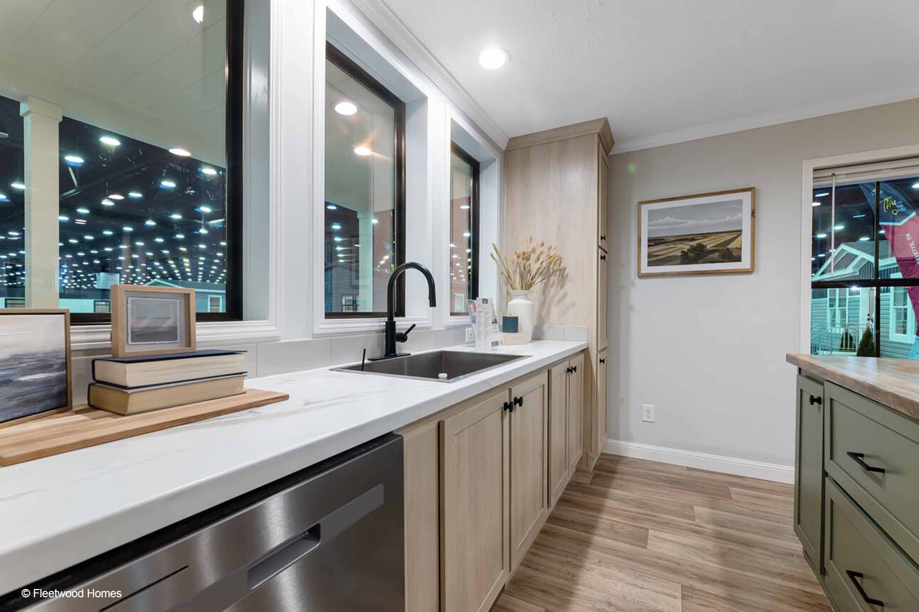 A modern white single-story manufactured home with large windows, a black roof, and a landscaped front yard.