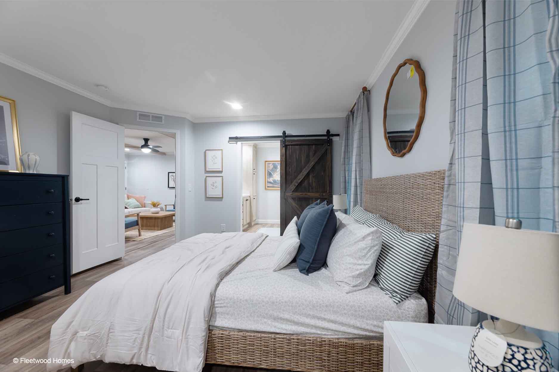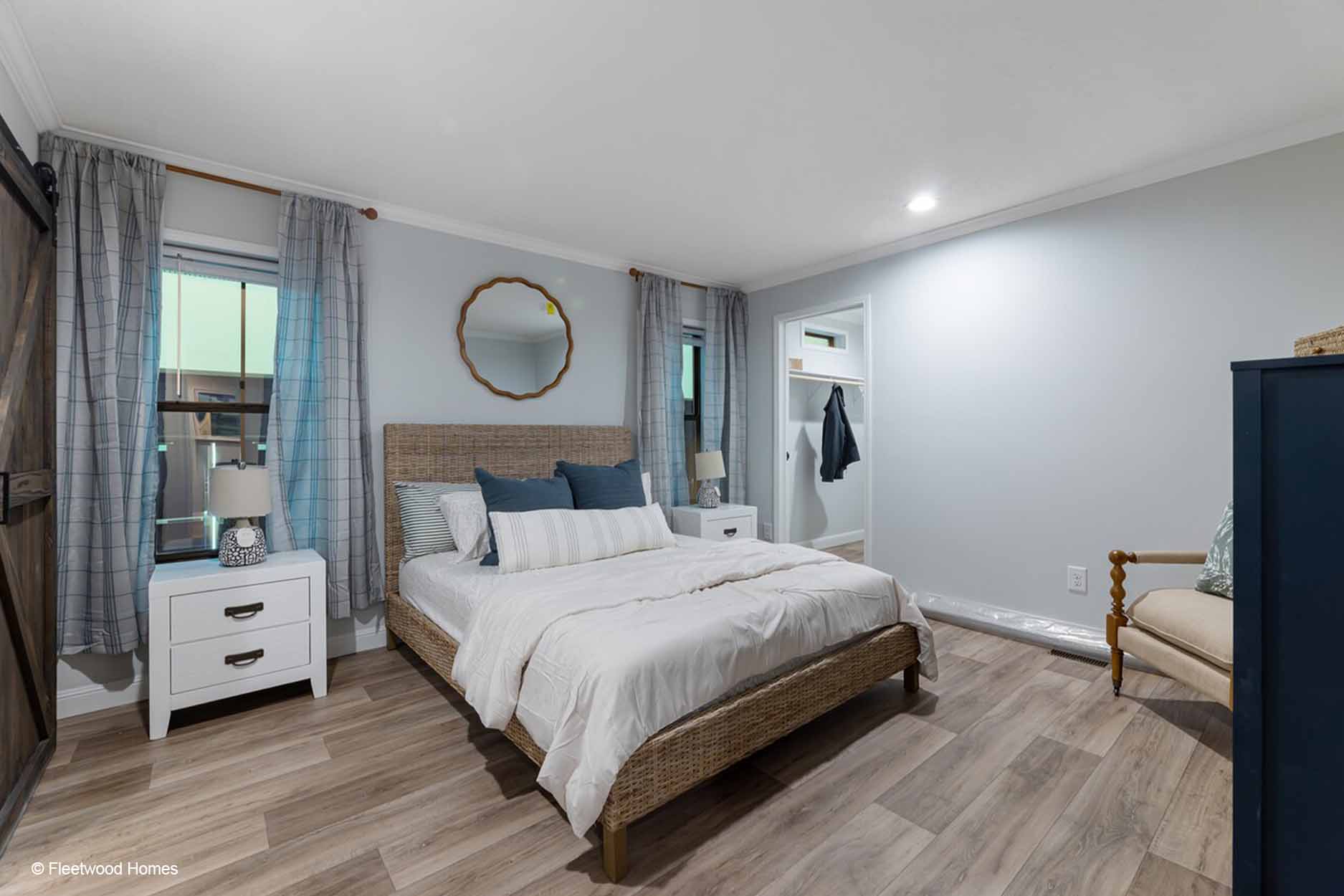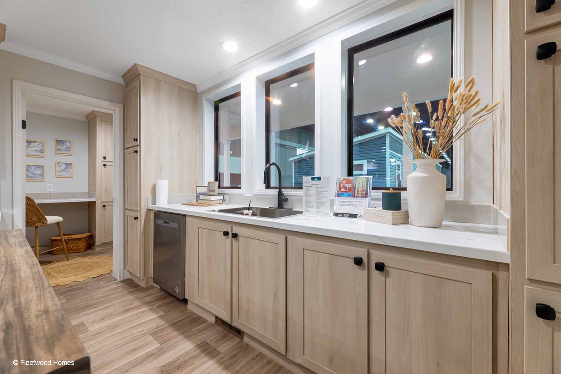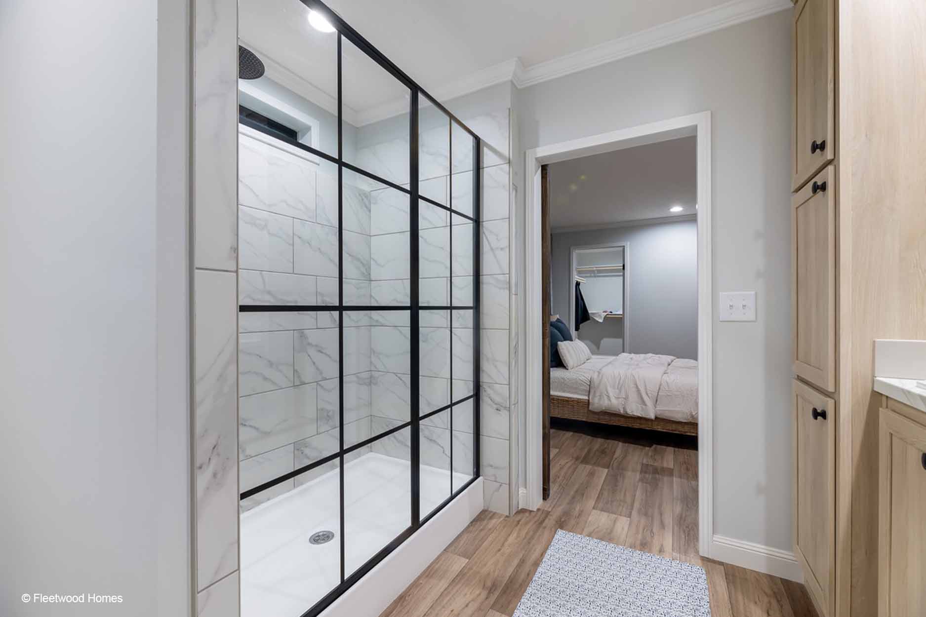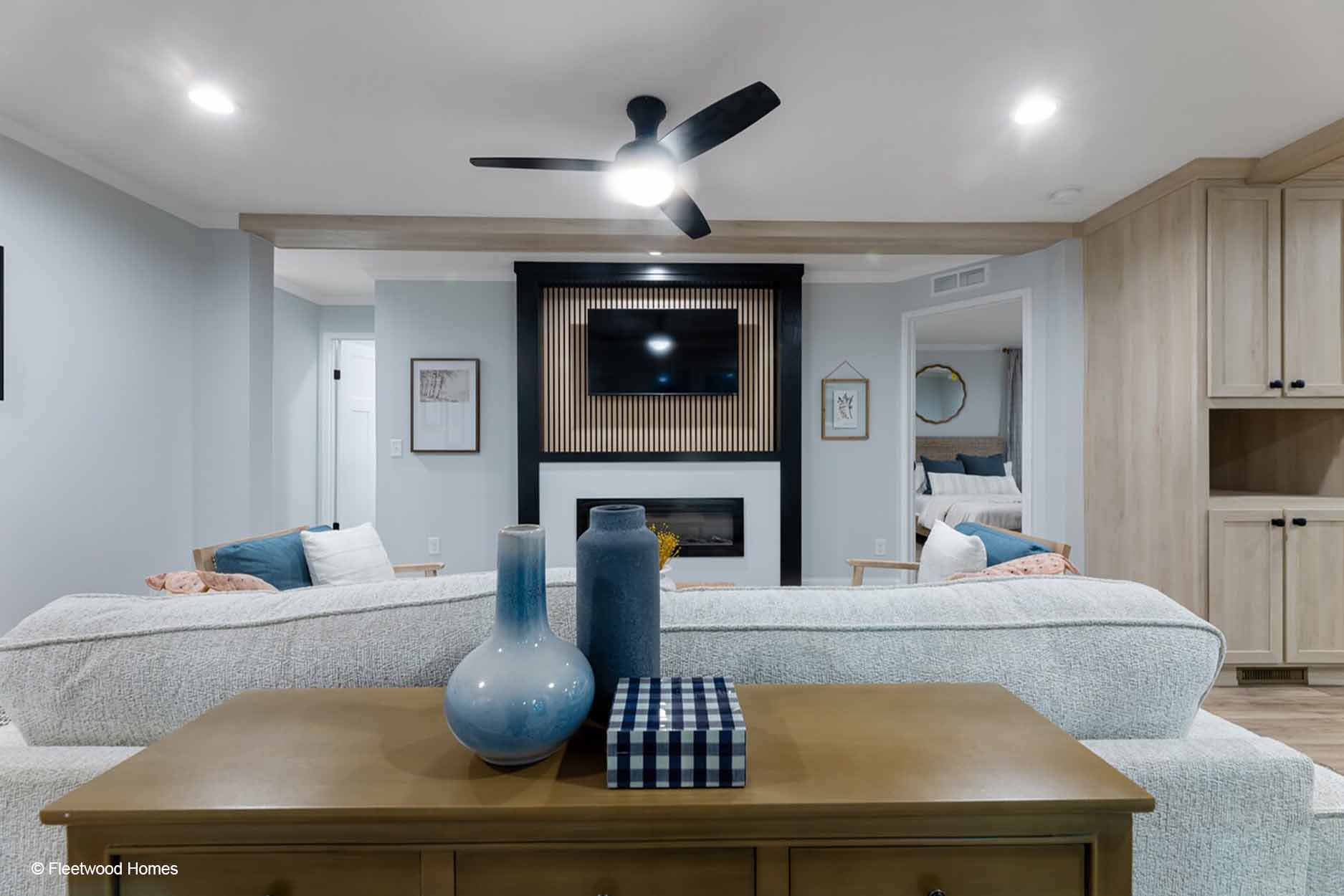 A modern white single-story manufactured home with large windows, a black roof, and a landscaped front yard.
