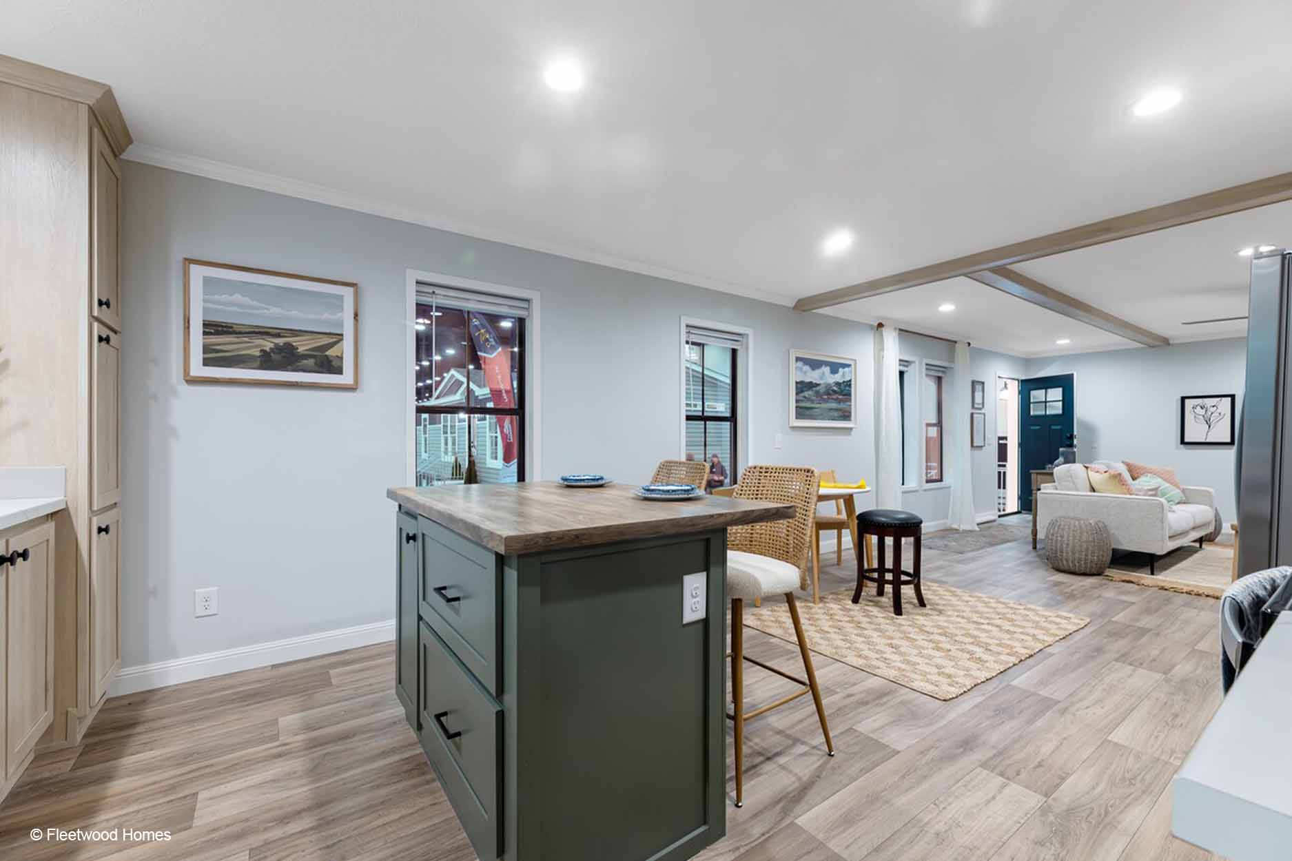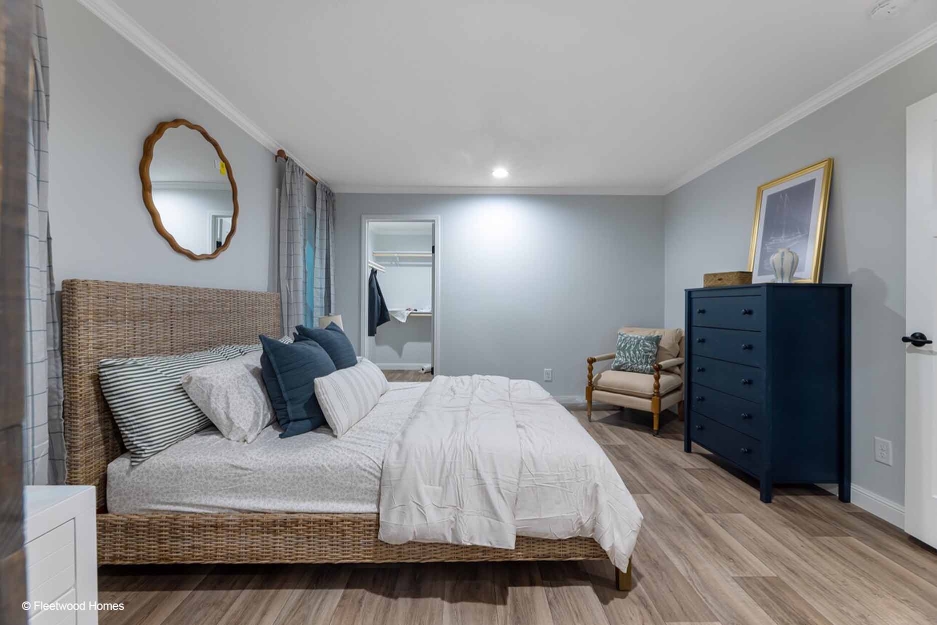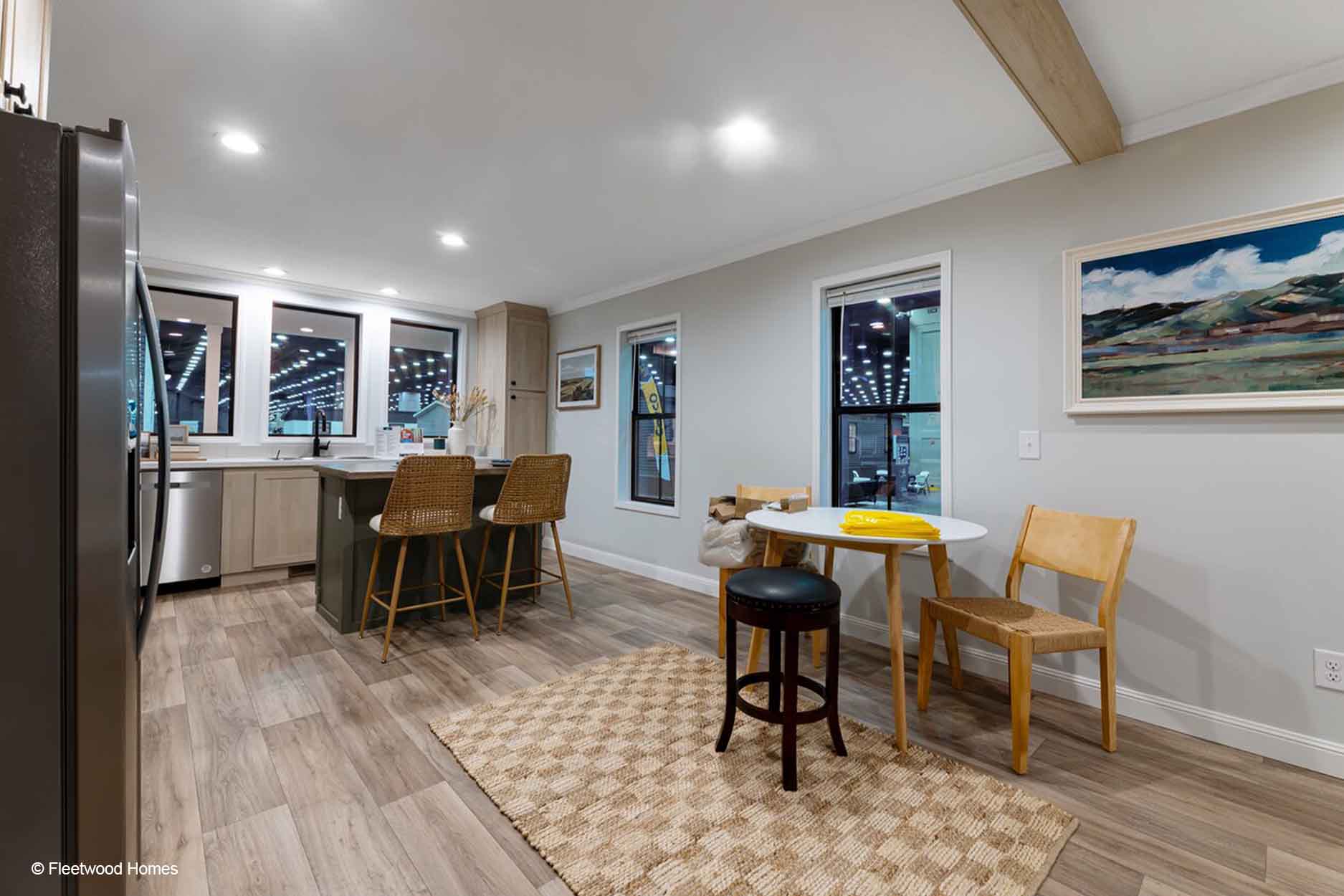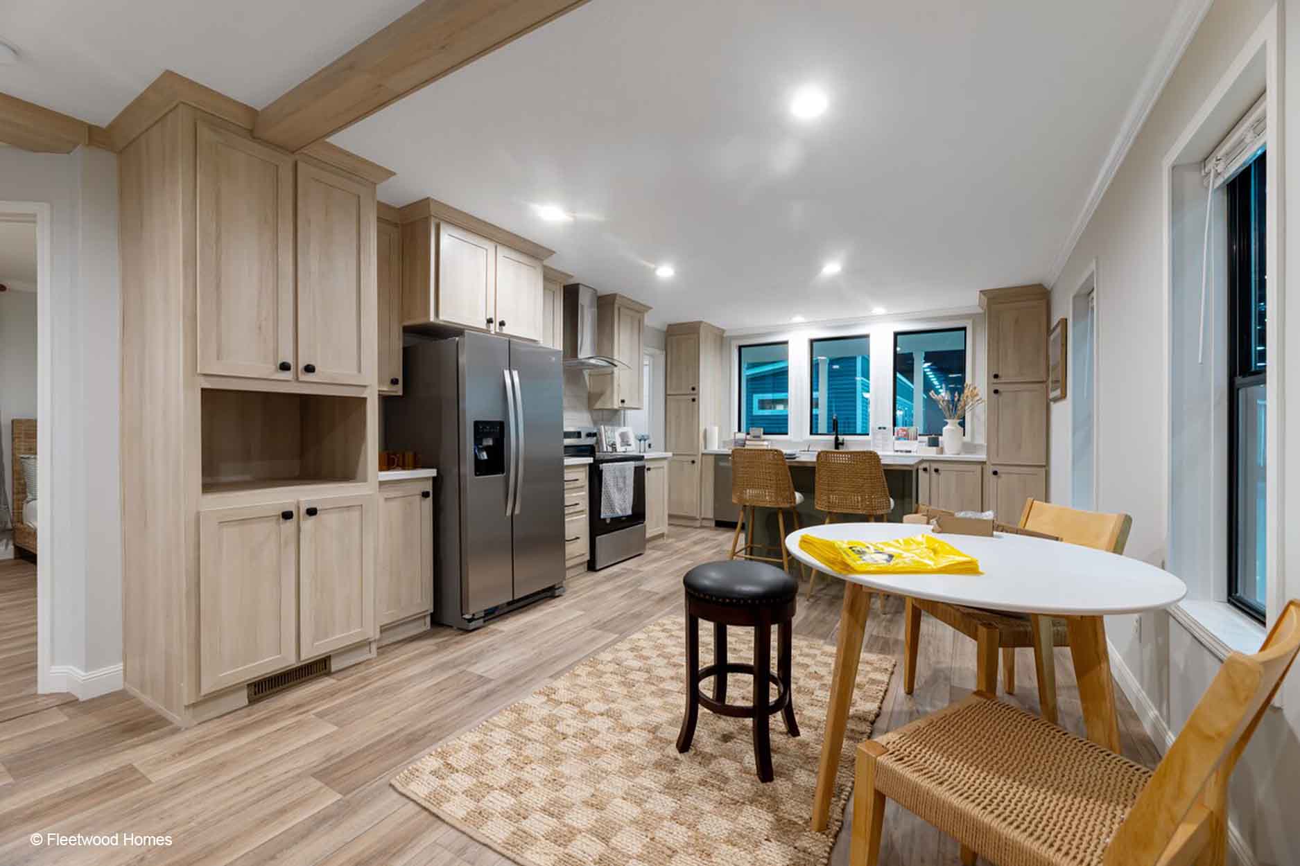 A modern white single-story manufactured home with large windows, a black roof, and a landscaped front yard.