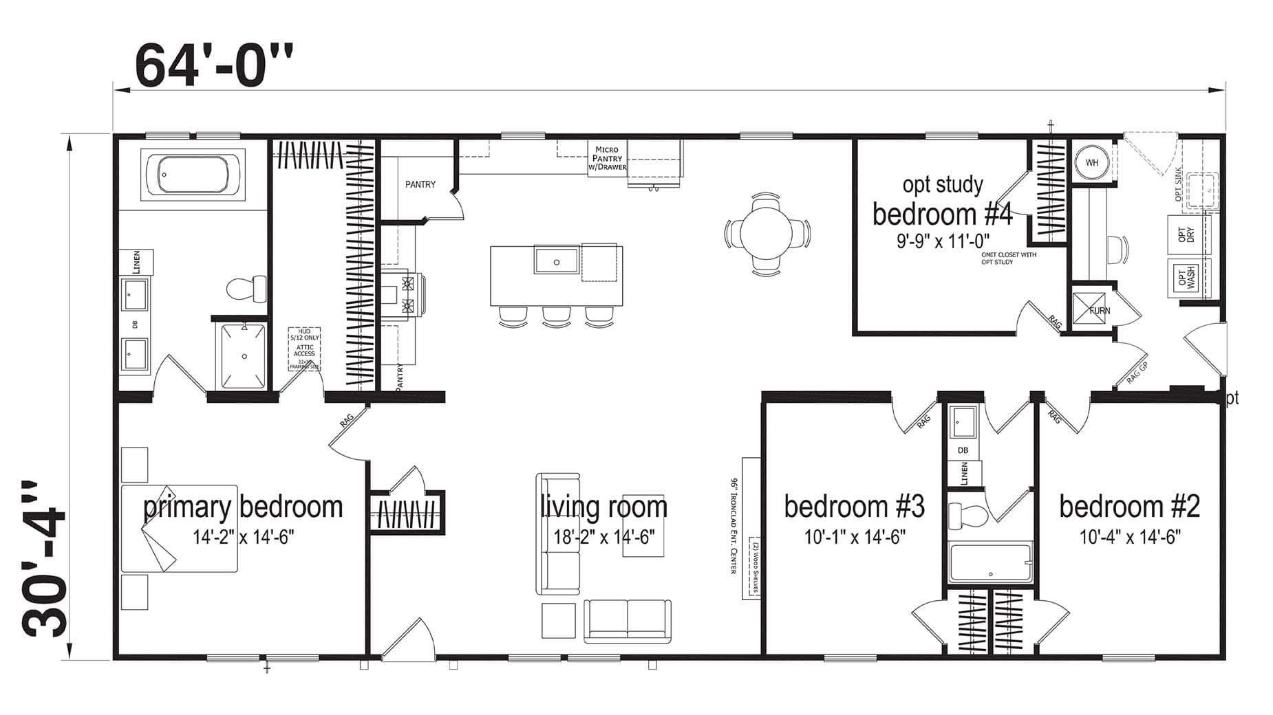 Black and white floor plan of a modular house with labeled rooms, measurements, and optional layout variations.