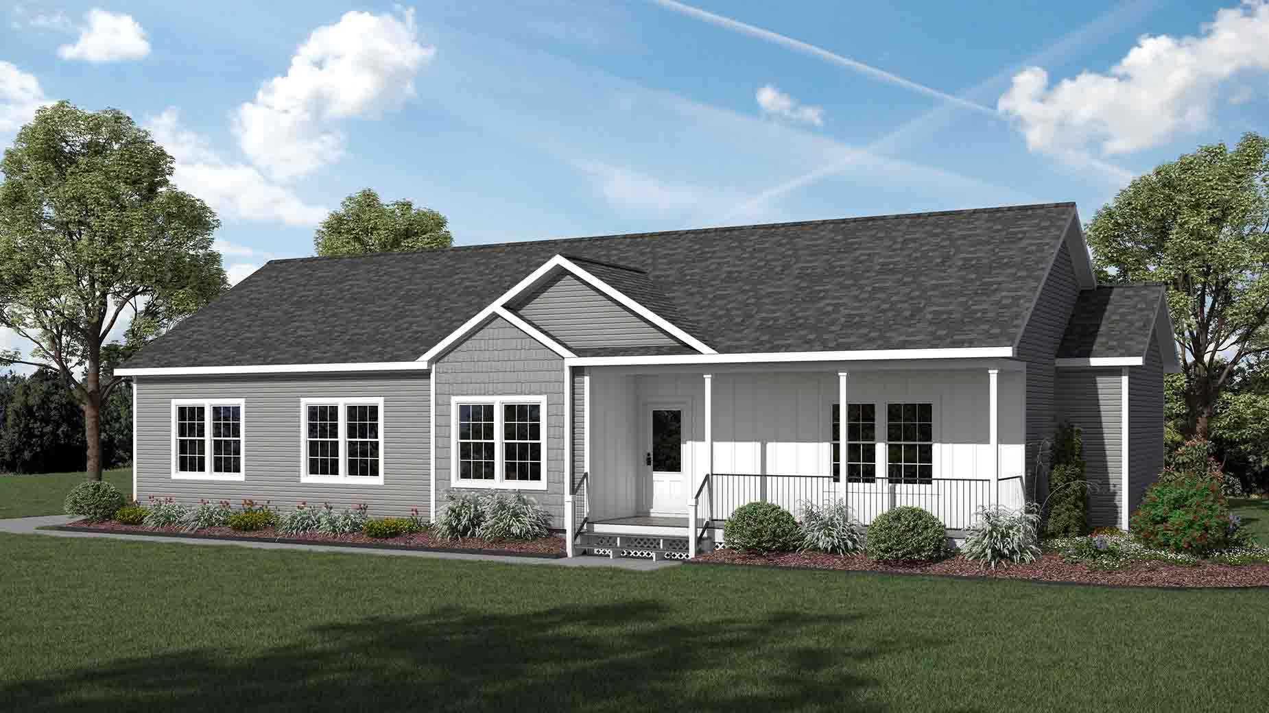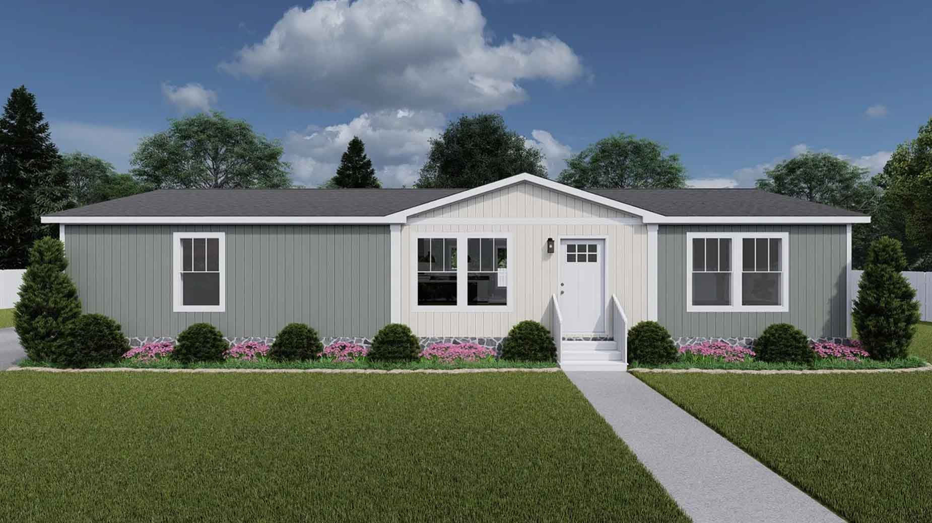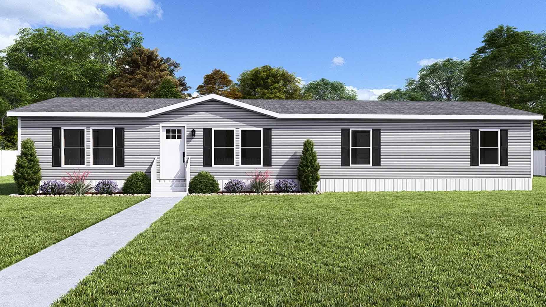 Single-story gray manufactured home with white trim, multiple windows, a front porch, and green lawn; trees in the background.